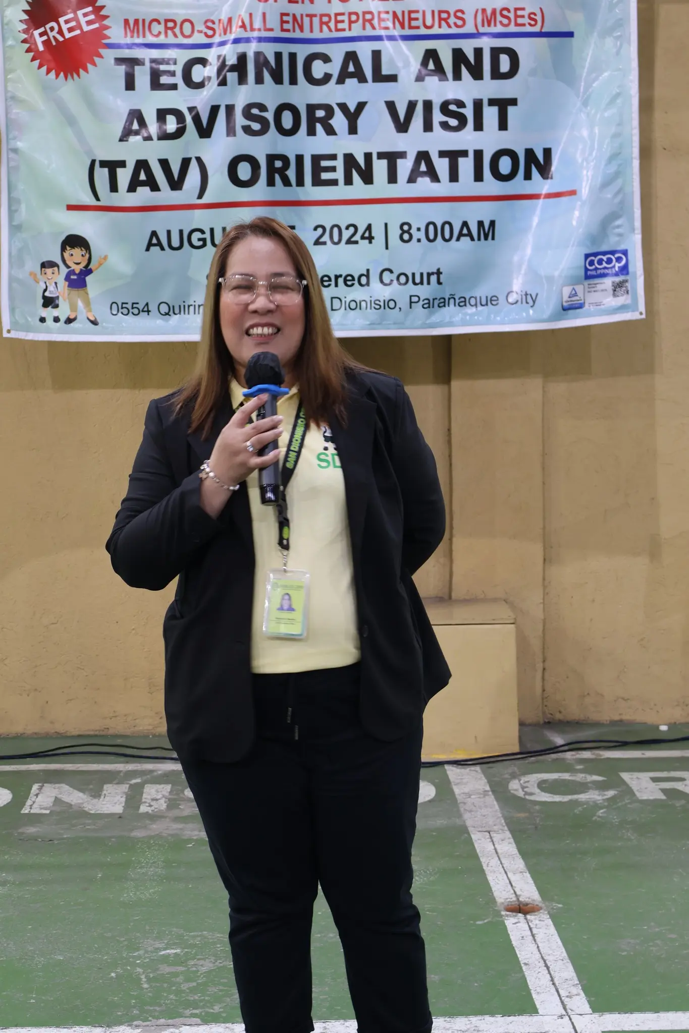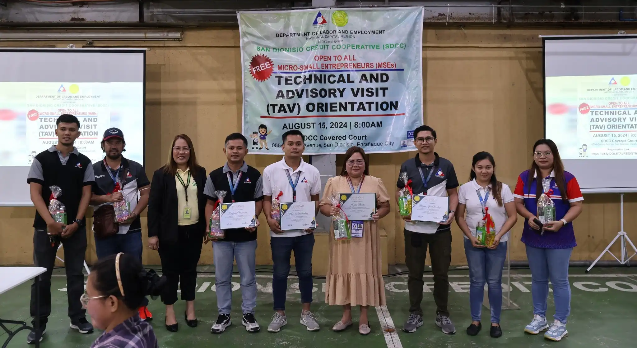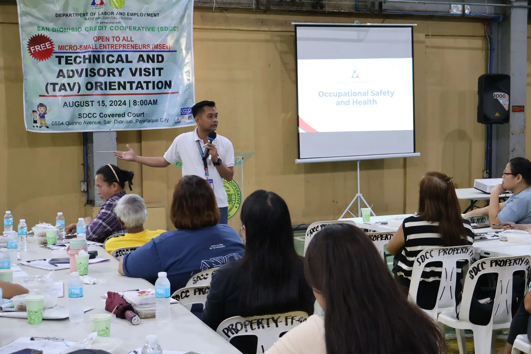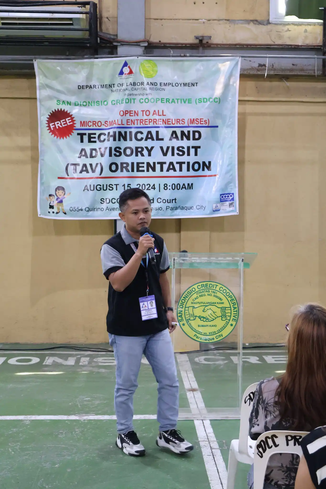 Ang Department of Labor and Employment – National Capital Region (DOLE – NCR), sa pakikipagtulungan ng San Dionisio Credit Cooperative (SDCC), ay matagumpay na nag-organisa ng Technical and Advisory Visit (TAV) Orientation noong Agosto 15, 2024. Ang kaganapang ito ay ginanap sa ang  SDCC Multi-Purpose Covered Court at partikular na idinisenyo para sa Micro-Small Entrepreneurs (MSEs).  Ang oryentasyon ay naglalayong magbigay sa mga MSE ng mahahalagang gabay sa mga batas sa paggawa, mga regulasyon sa kaligtasan, at pinakamahuhusay na kasanayan sa negosyo. Sa pamamagitan ng pagsasama-sama ng mga mapagkukunan ng gobyerno at suporta sa komunidad, ang kaganapan ay nagsilbing isang mahalagang plataporma para sa mga may-ari ng maliliit na negosyo upang mas maunawaan ang kanilang mga responsibilidad at mapabuti ang pagsunod sa mga pamantayan sa paggawa.